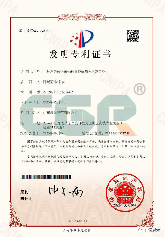2023年08月04日,山東晨光膠帶有限公司新增獲兩項發明專利。“基于計算機視覺的高強傳送帶跑偏檢測方法”、“一種高強傳送帶物料智能檢測方法及系統”。