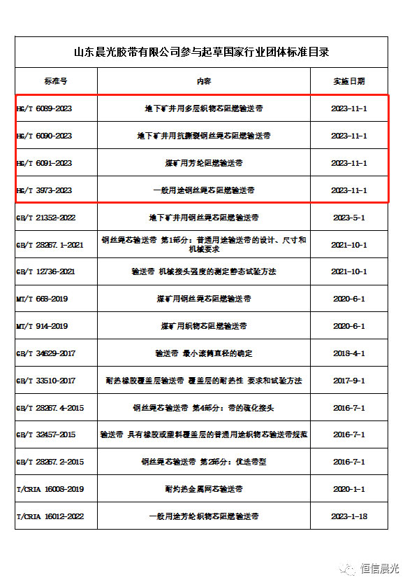 由我公司參與起草的HG/T 6089-2023《地下礦井用多層織物芯阻燃輸送帶》、HG/T 6090-2023《地下礦井用防撕裂鋼絲繩芯阻燃輸送帶》、HG/T 6091-2023《煤礦用芳綸阻燃輸送帶》、HG/T 3973-2023《一般用途鋼絲繩芯阻燃輸送帶》四項行業(yè)標準發(fā)布實施!
